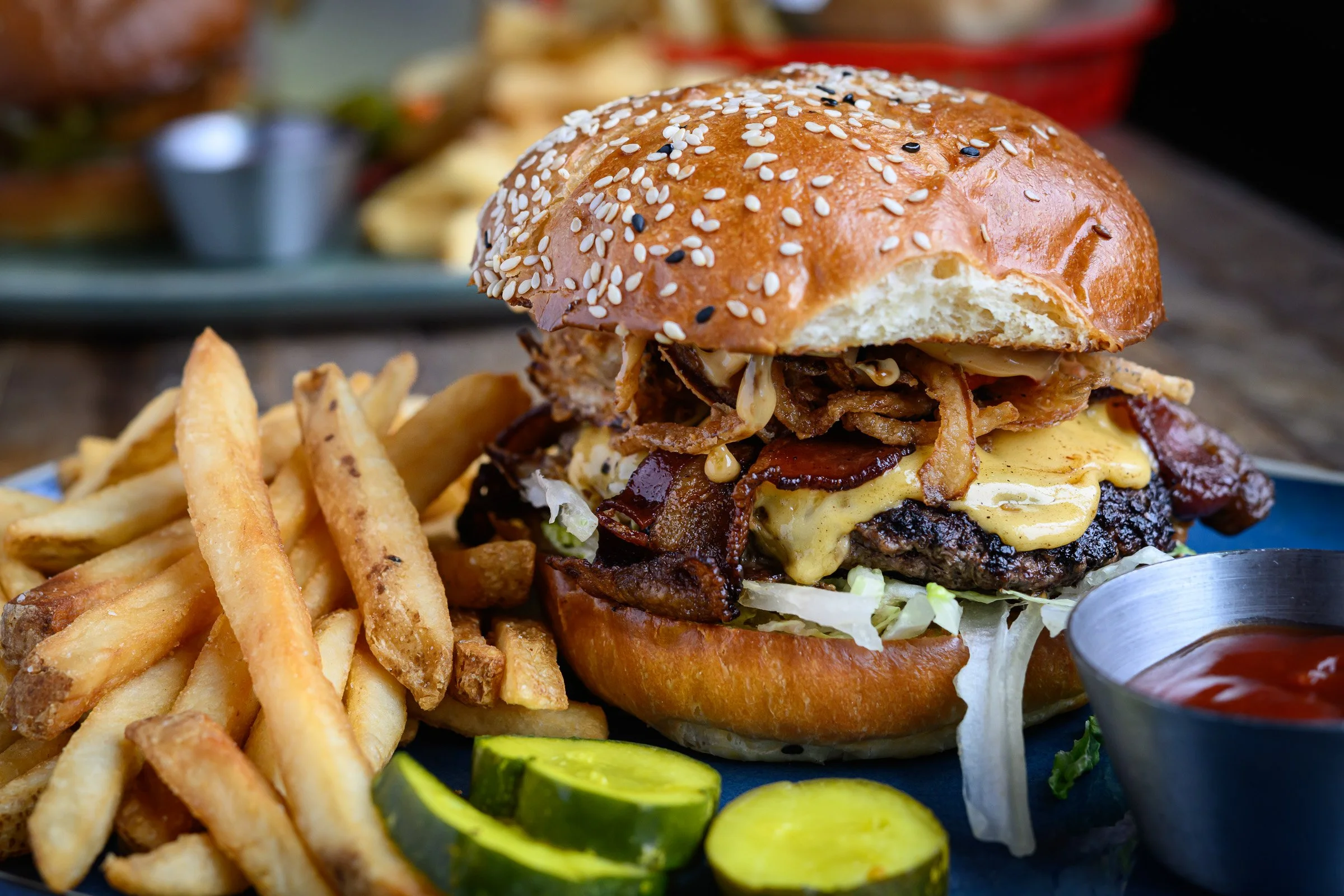 Custom-ground Snake River Farms Wagyu beef, smoked bacon, double American cheese, Mama Lil’s Peppers, crispy fried onions, iceberg lettuce, Tavern Burger Sauce, served on a Macrina Bakery sesame seed brioche bun.