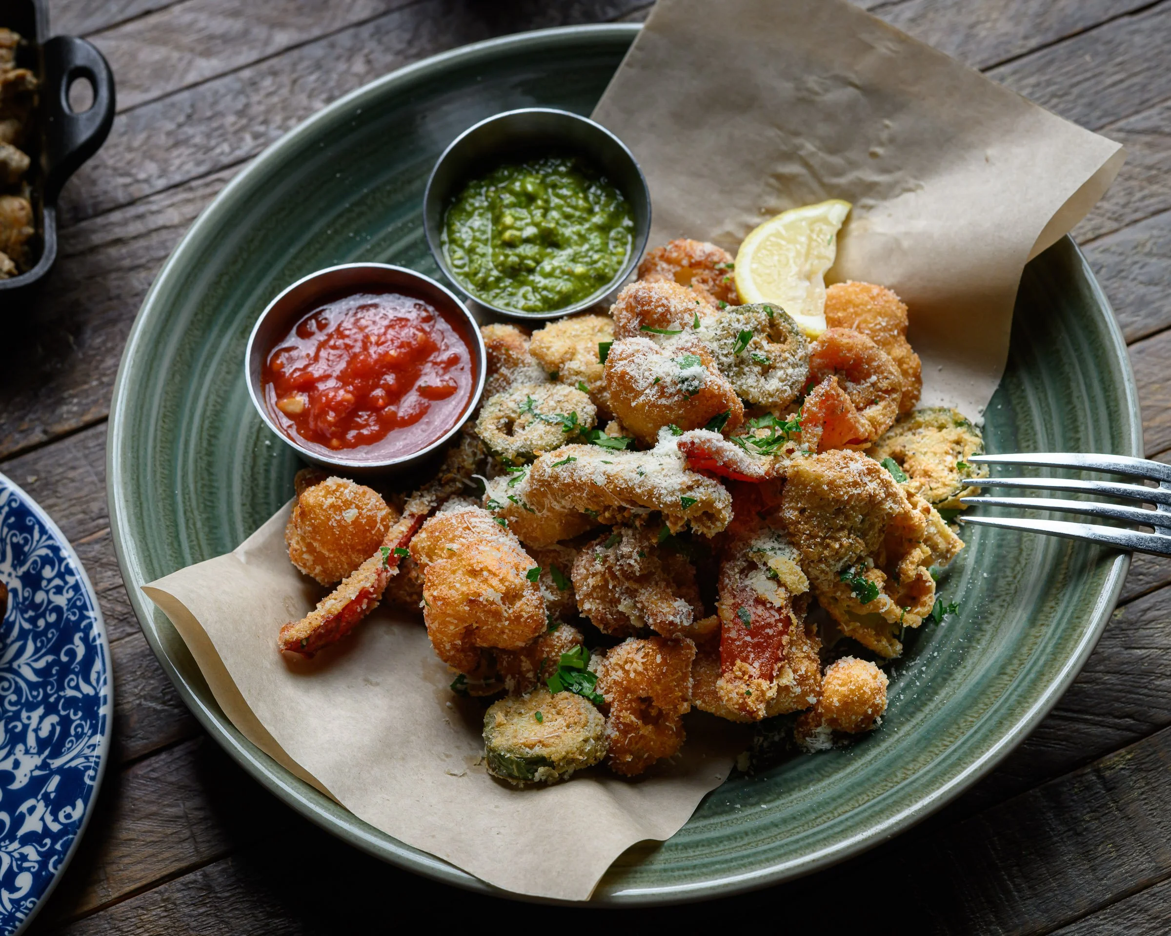 Crispy buttermilk marinated cauliflower, artichokes, red pepper and jalapeño, dusted with parmesan, served with marinara and pistachio-basil pesto.